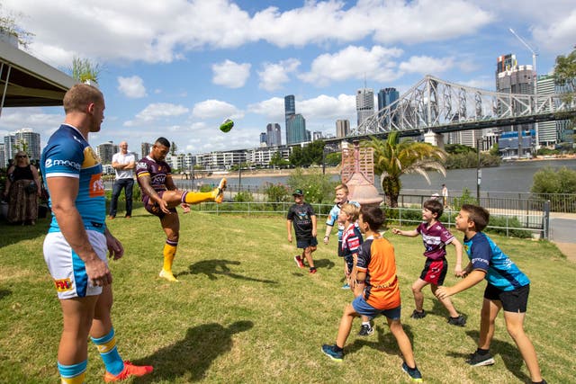 Players from the Gold Coast Titans and Brisbane Broncos kick the ball around with young NRL fans during the 2021 Magic Round Launch at Bougainvillea House in Brisbane, Australia. (Photo by Jono Searle/Getty Images)
