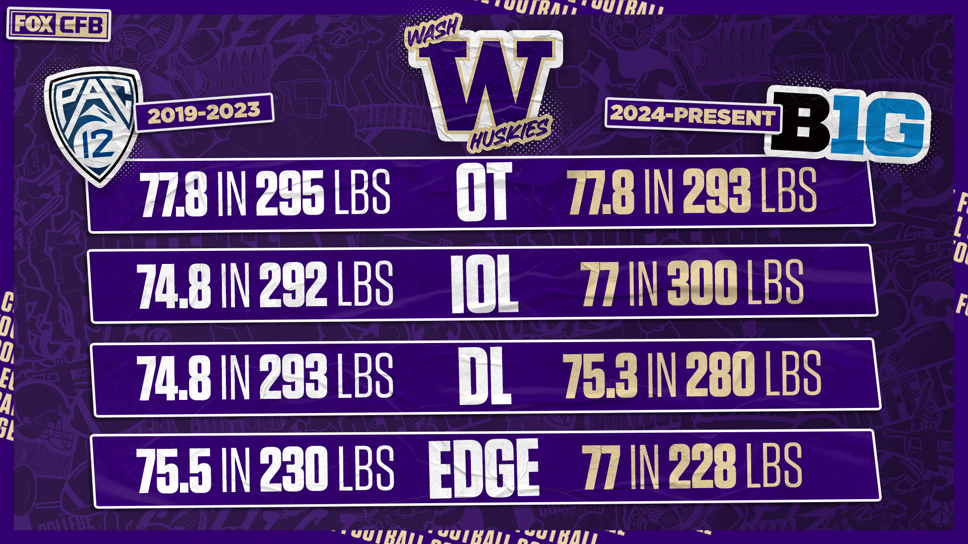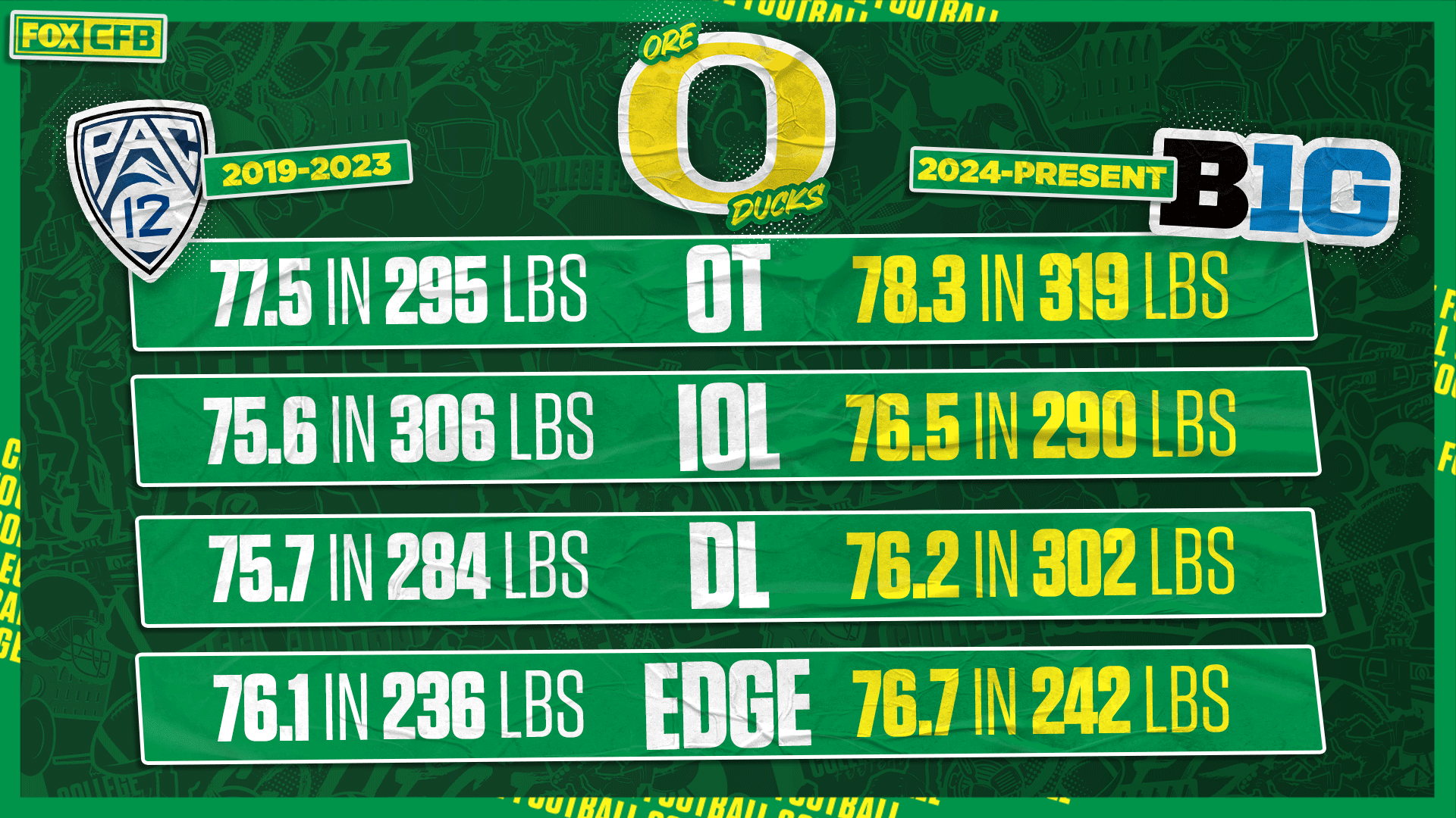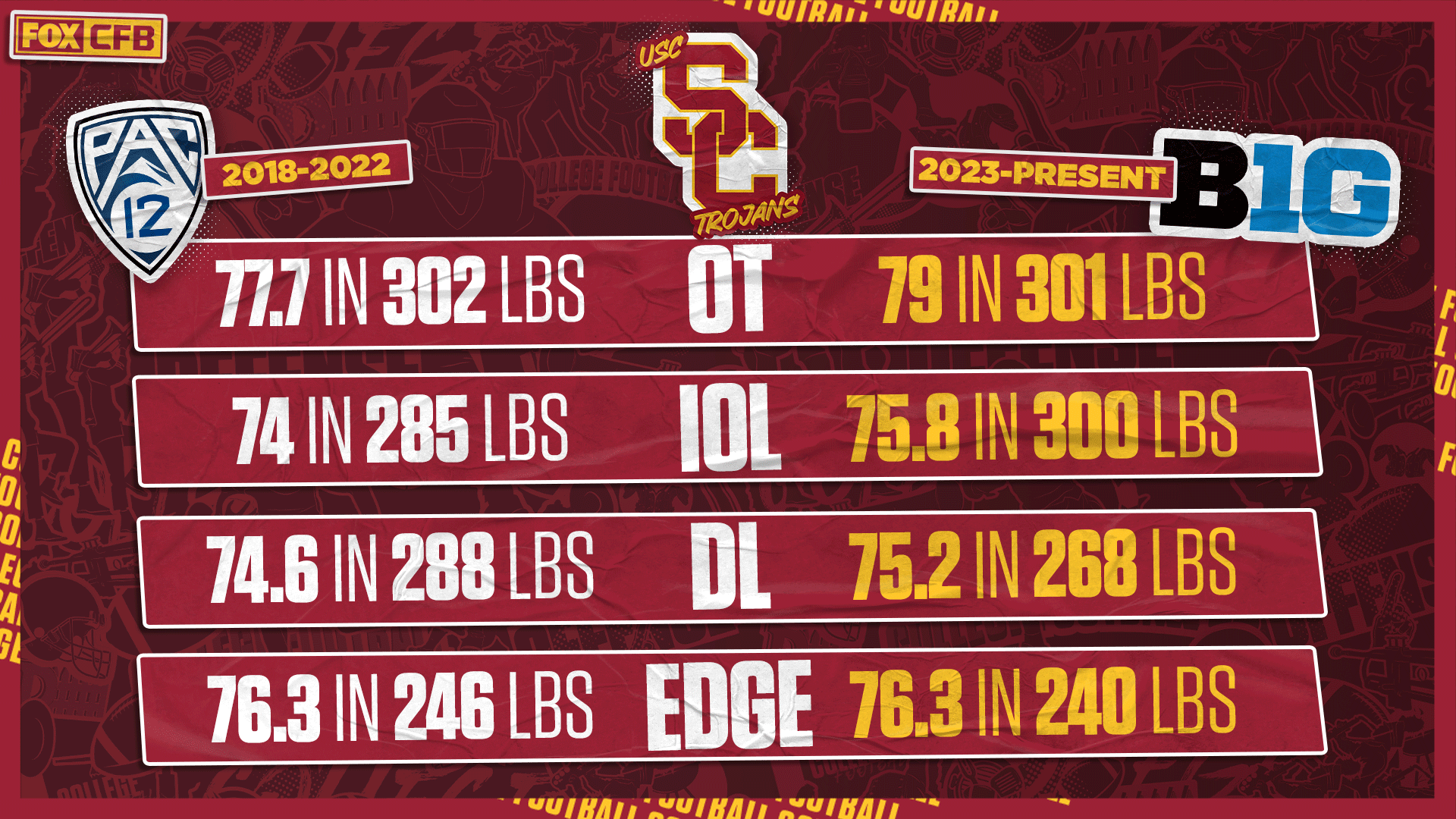 To understand the pace and scope of these potential body-type changes for the four incoming Big Ten schools, FOX Sports analyzed years of high school recruiting data along the offensive and defensive lines. For Oregon and Washington, whose impending arrival wasn’t announced until Aug. 4, 2023, the average heights and weights of prospects from the three most recent recruiting classes (2024 to 2026) were compared to values from the five previous classes (2019 to 2023). For USC and UCLA, whose eventual transition to the Big Ten was first reported on June 30, 2022, prospects from their four most recent recruiting classes (2023 to 2026) were compared to the five classes prior to conference realignment news (2018 to 2022). All measurements and recruiting rankings came from the 247Sports Composite.