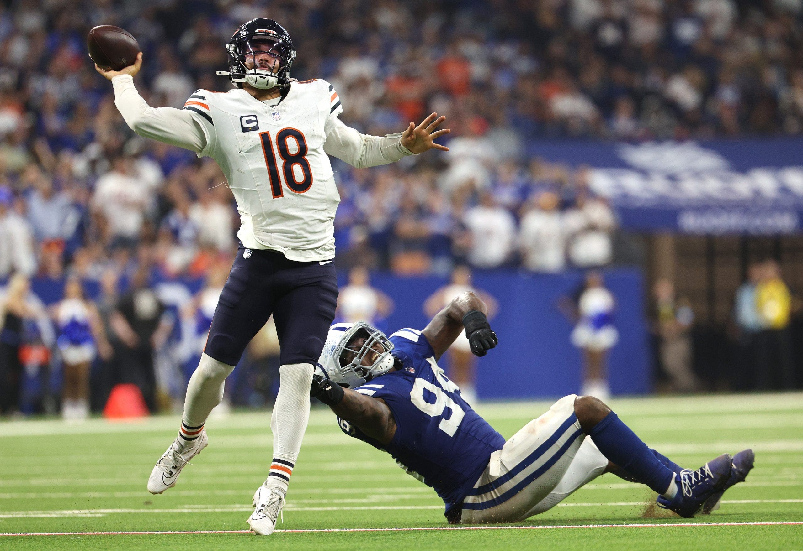 Tyquan Lewis of the Colts pressures Bears QB Caleb Williams during Sunday’s Week 3 contest. (Photo by Michael Hickey/Getty Images)