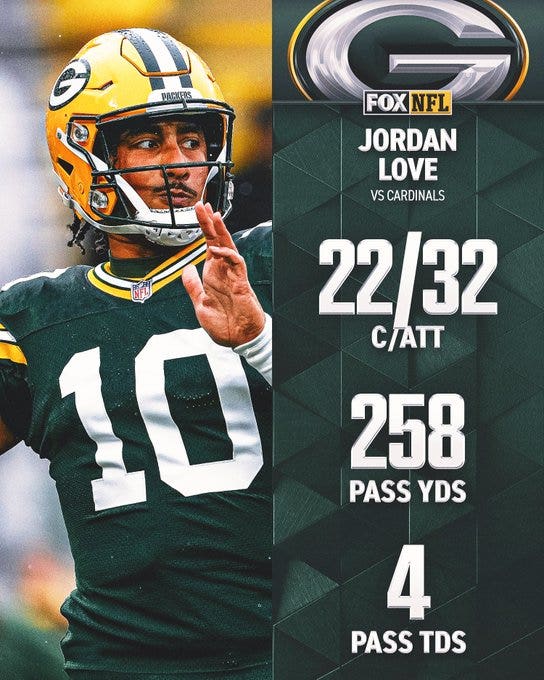In his third game back since suffering a knee injury at the start of the season, Love is rounding into form. He finished 22-of-32 with 258 yards and four touchdowns, with one interception. Love completed passes to nine different pass-catchers.