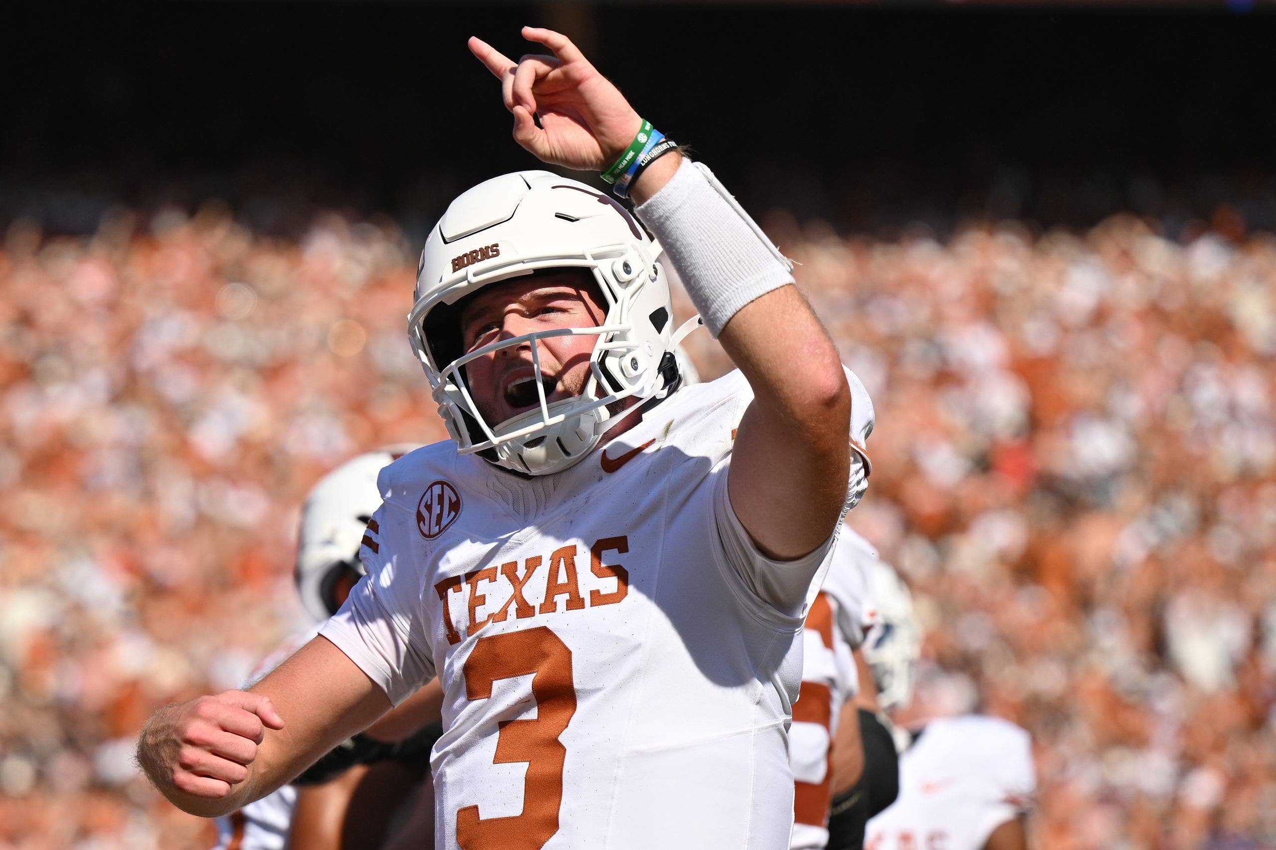 Texas QB Quinn Ewers threw for just 199 yards, one touchdown and an interception in his return from injury, but it was enough to take down Oklahoma, 34-3. (Photo by Sam Hodde/Getty Images)