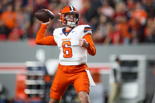 Syracuse QB Kyle McCord has thrown for 2,160 yards, 19 touchdowns and six interceptions this season. (Photo by Nicholas Faulkner/Icon Sportswire via Getty Images)