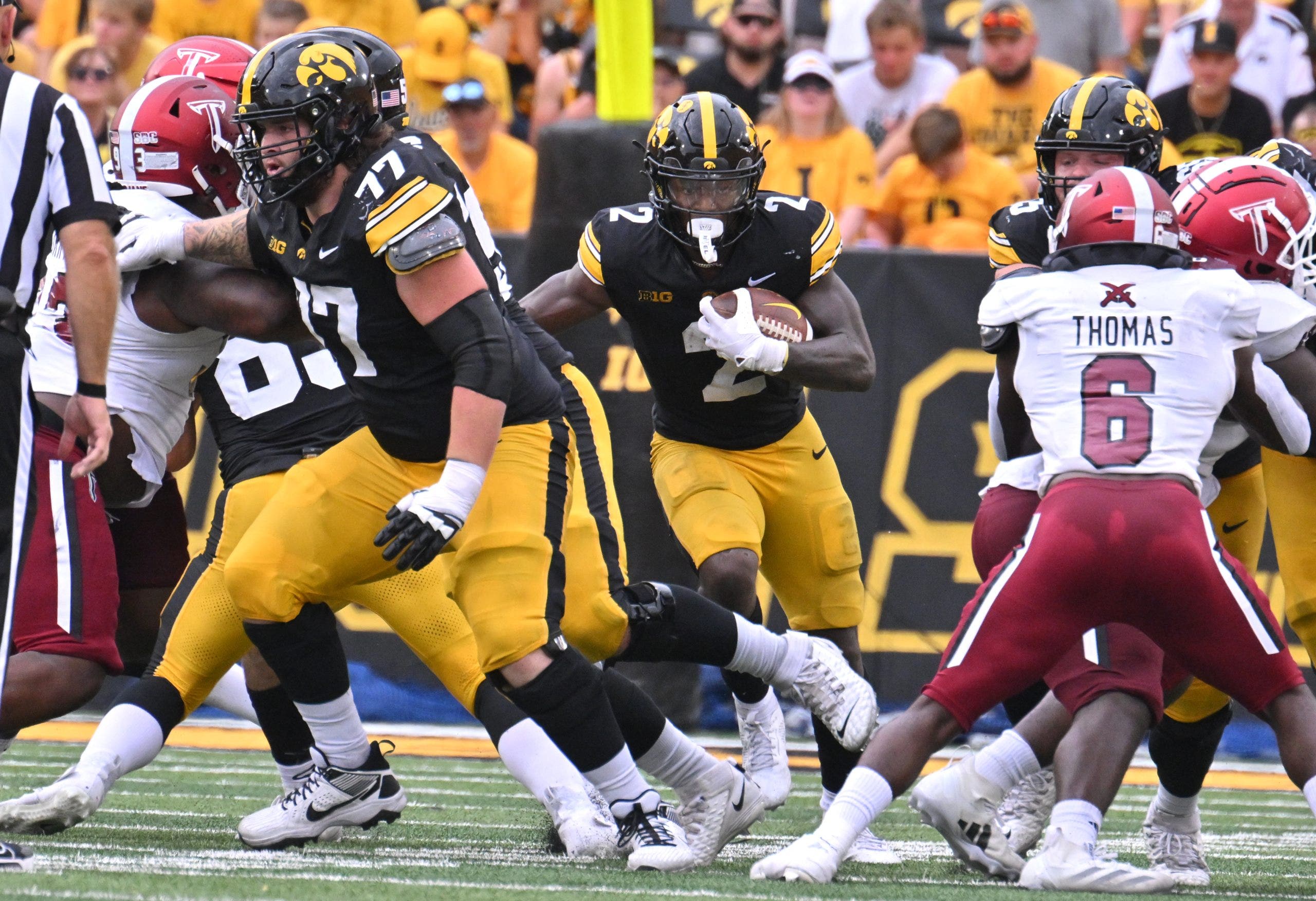 Iowa RB Kaleb Johnson has 82 carries for 685 yards and nine touchdowns this season. (Photo by Keith Gillett/IconSportswire)