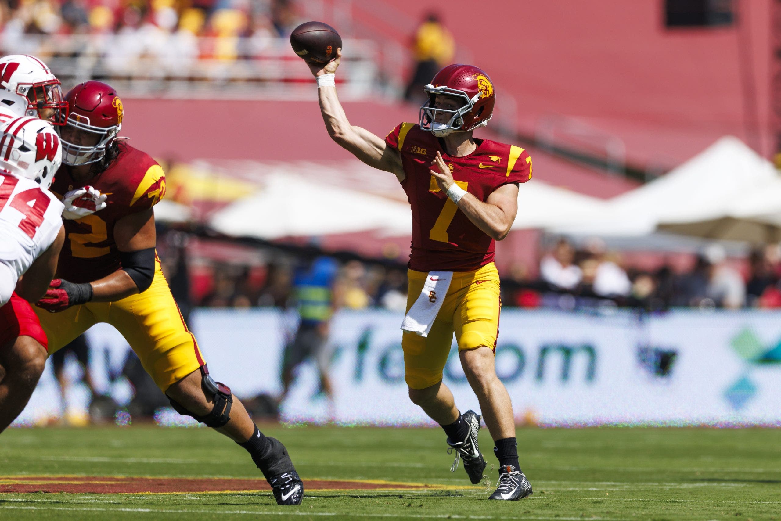 Causes for concern: A leaky and overmatched offensive line has surrendered 49 quarterback pressures through USC’s first four games, which has exposed Moss to far more hits than Riley would feel comfortable with. Personnel changes at the tackle positions seemed to help slightly in the second half against Michigan, but the amount of punishment Moss has absorbed is concerning. Lynn’s defense has played a bend-but-don’t-break style thus far and struggles to stop the run. The Trojans’ allowance of 5.01 yards per carry is tied for 111th nationally and 16th in the Big Ten.