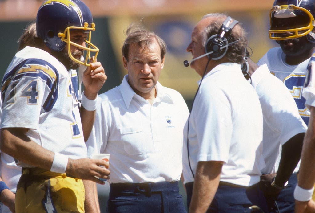 Dan Fouts’ Hall of Fame career took off when Don Coryell (center) brought his pass-heavy scheme to the Chargers. (Photo by Focus on Sport/Getty Images)