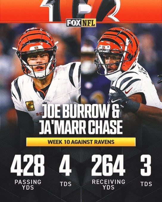 Even after a 35-34 heartbreaking loss to the Baltimore Ravens on Thursday, Cincinnati has won three of its past five games. Burrow has put the Bengals on his back. Since Week 5, he has thrown for 1,694 yards and 17 touchdowns, with just three interceptions.