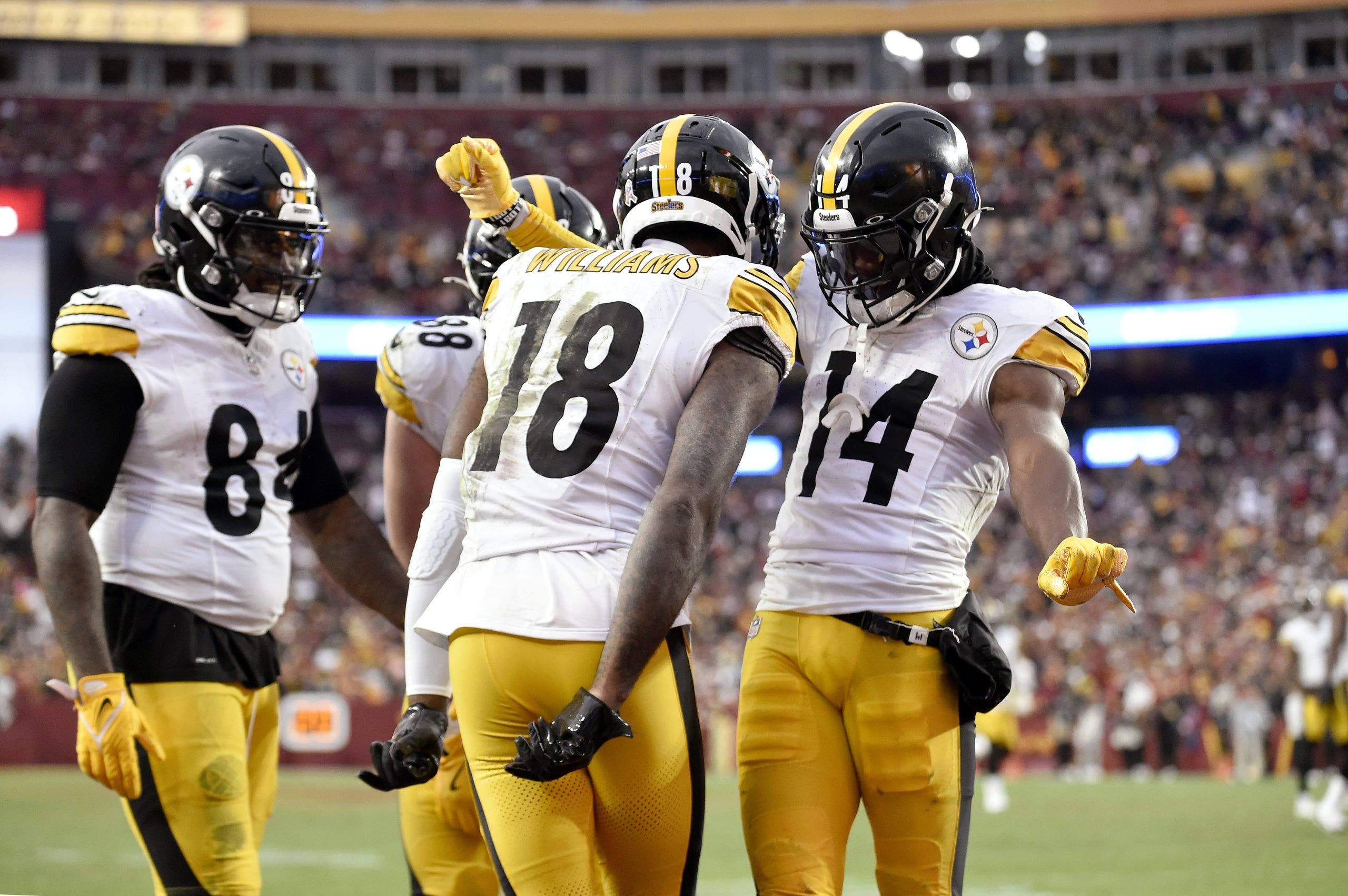 New Steelers WR Mike Williams (No. 18) caught a touchdown in his debut with the team, while George Pickens (No. 14) added 91 receiving yards and a touchdown. (Photo by Randy Litzinger/Icon Sportswire via Getty Images)