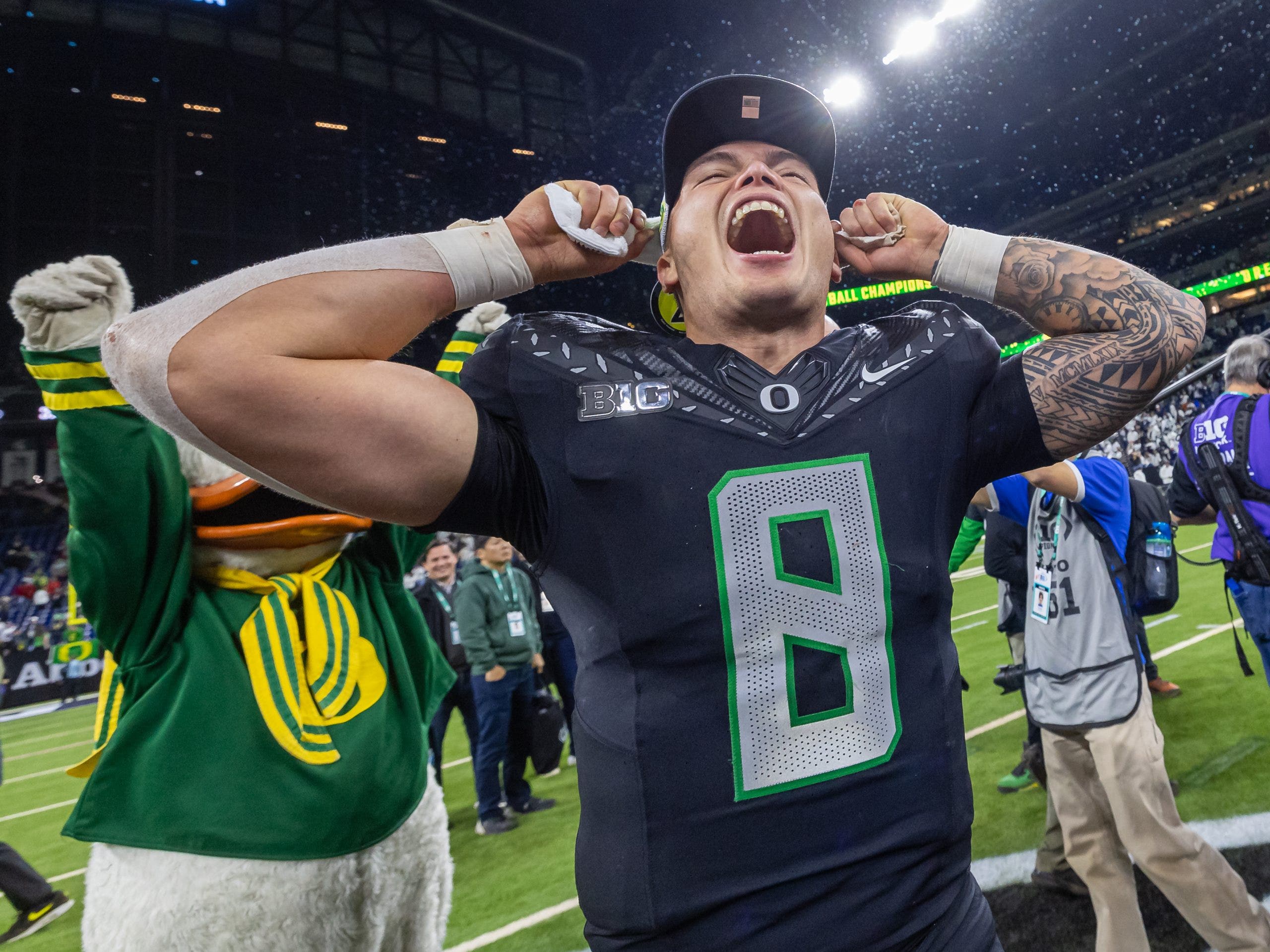 Dillon Gabriel of the Oregon Ducks celebrates winning the Big Ten Championship following the game against the Penn State Nittany Lions. (Photo by Michael Hickey/Getty Images)