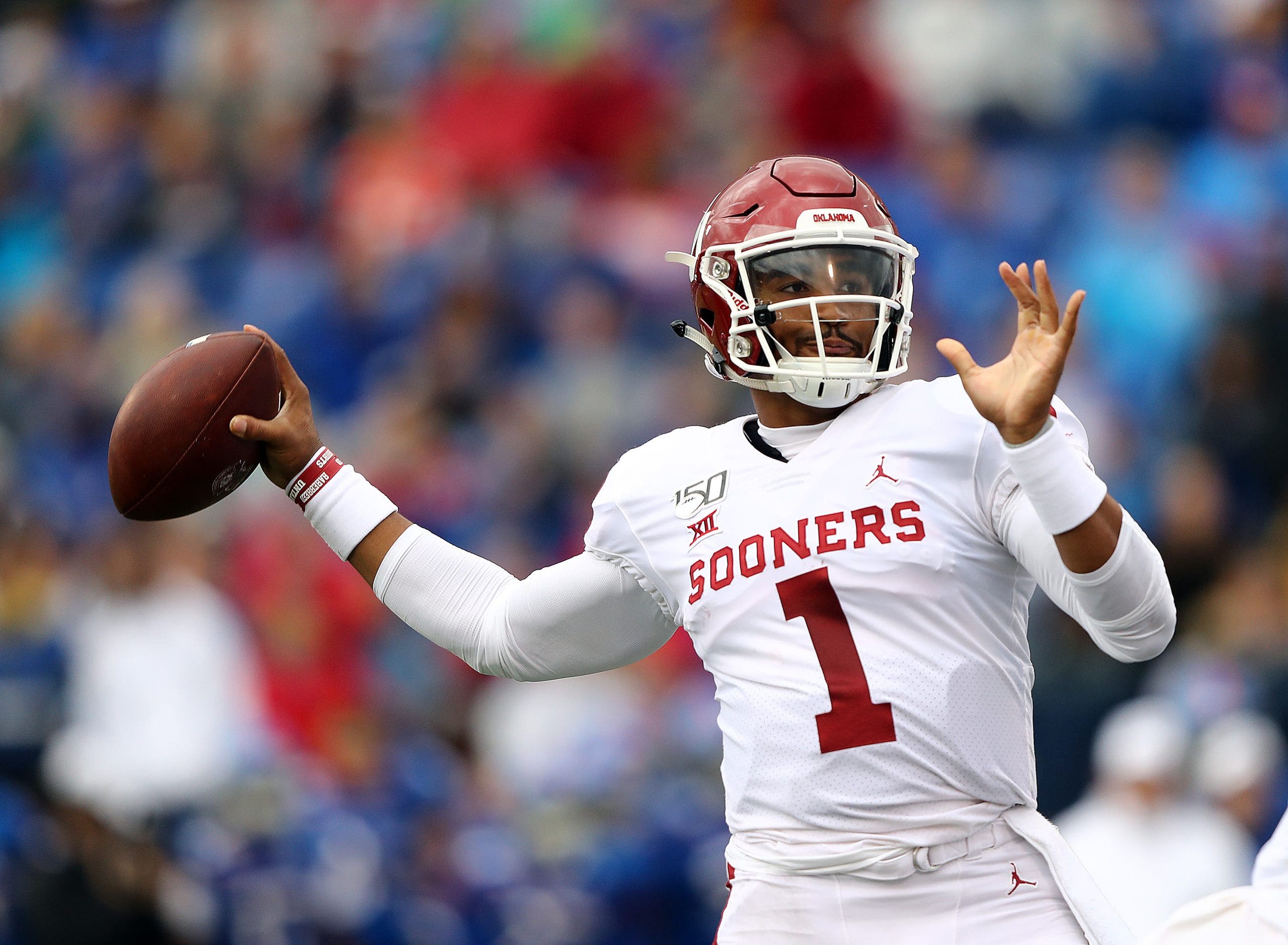 Oklahoma Sooners quarterback Jalen Hurts passes during the game against the Kansas Jayhawks at Memorial Stadium. (Photo by Jamie Squire/Getty Images)