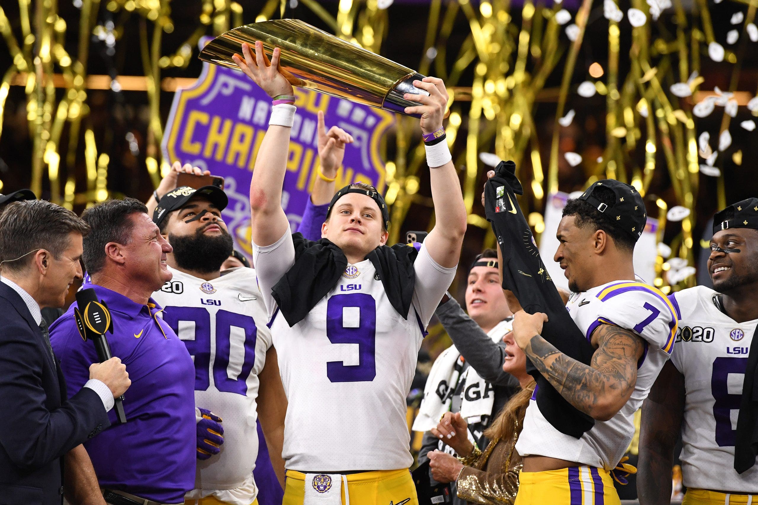 Joe Burrow of the LSU Tigers holds up the trophy after defeating the Clemson Tigers during the College Football Playoff National Championship. (Photo by Jamie Schwaberow/Getty Images)