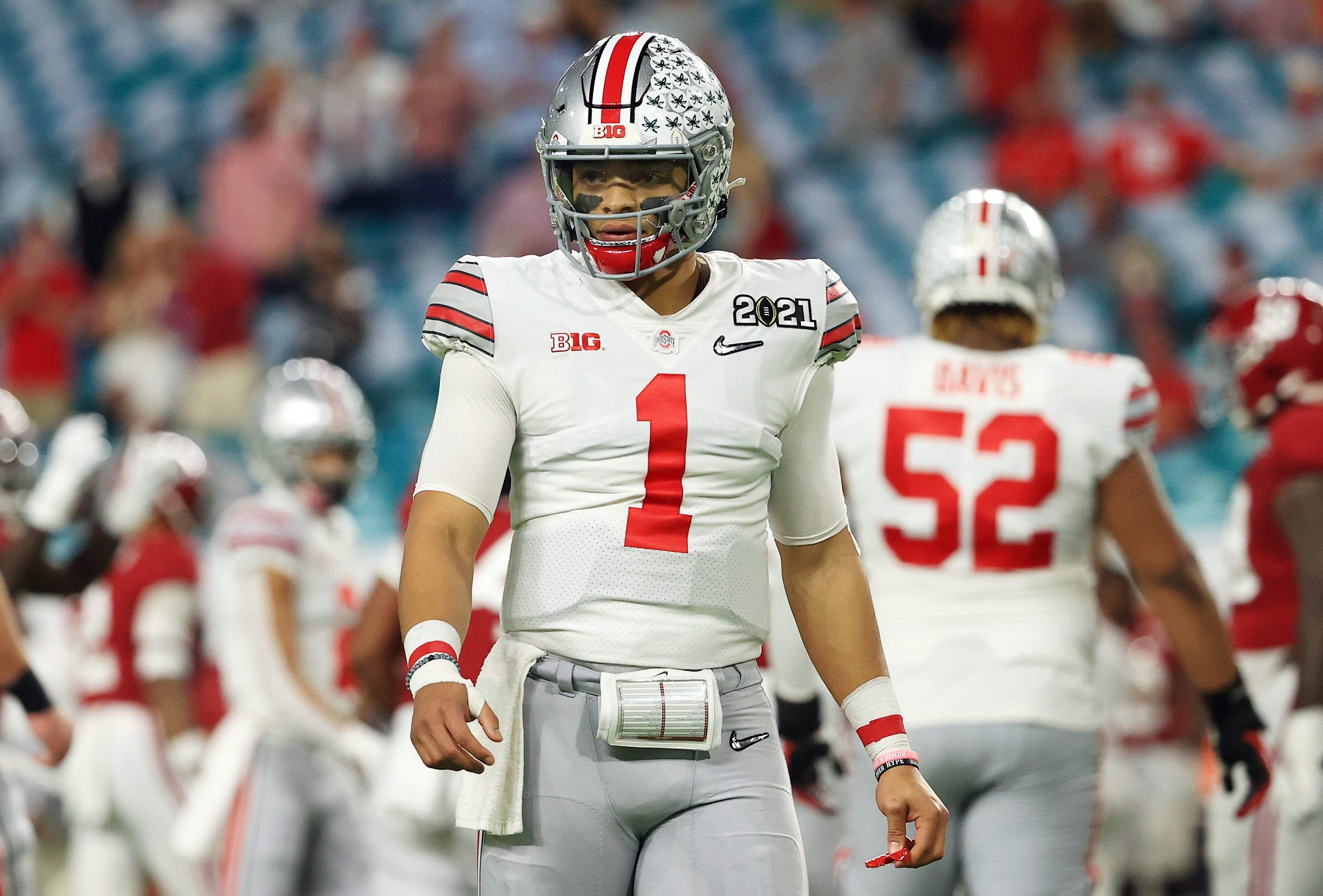 Justin Fields of the Ohio State Buckeyes looks on during the first quarter of the College Football Playoff National Championship game against the Alabama Crimson Tide. (Photo by Mike Ehrmann/Getty Images)