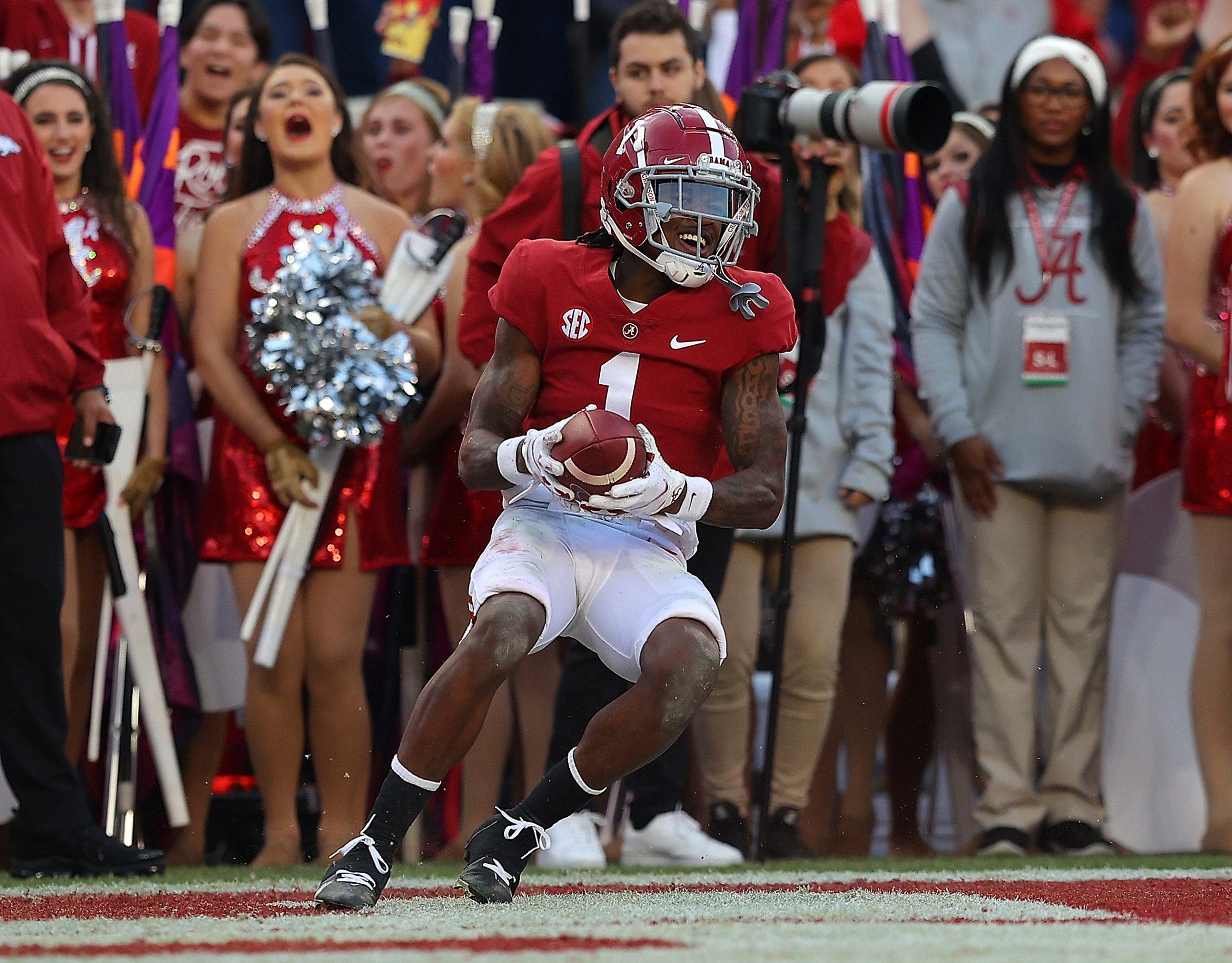 Jameson Williams of the Alabama Crimson Tide reacts after diving for a touchdown against the Arkansas Razorbacks. (Photo by Kevin C. Cox/Getty Images)