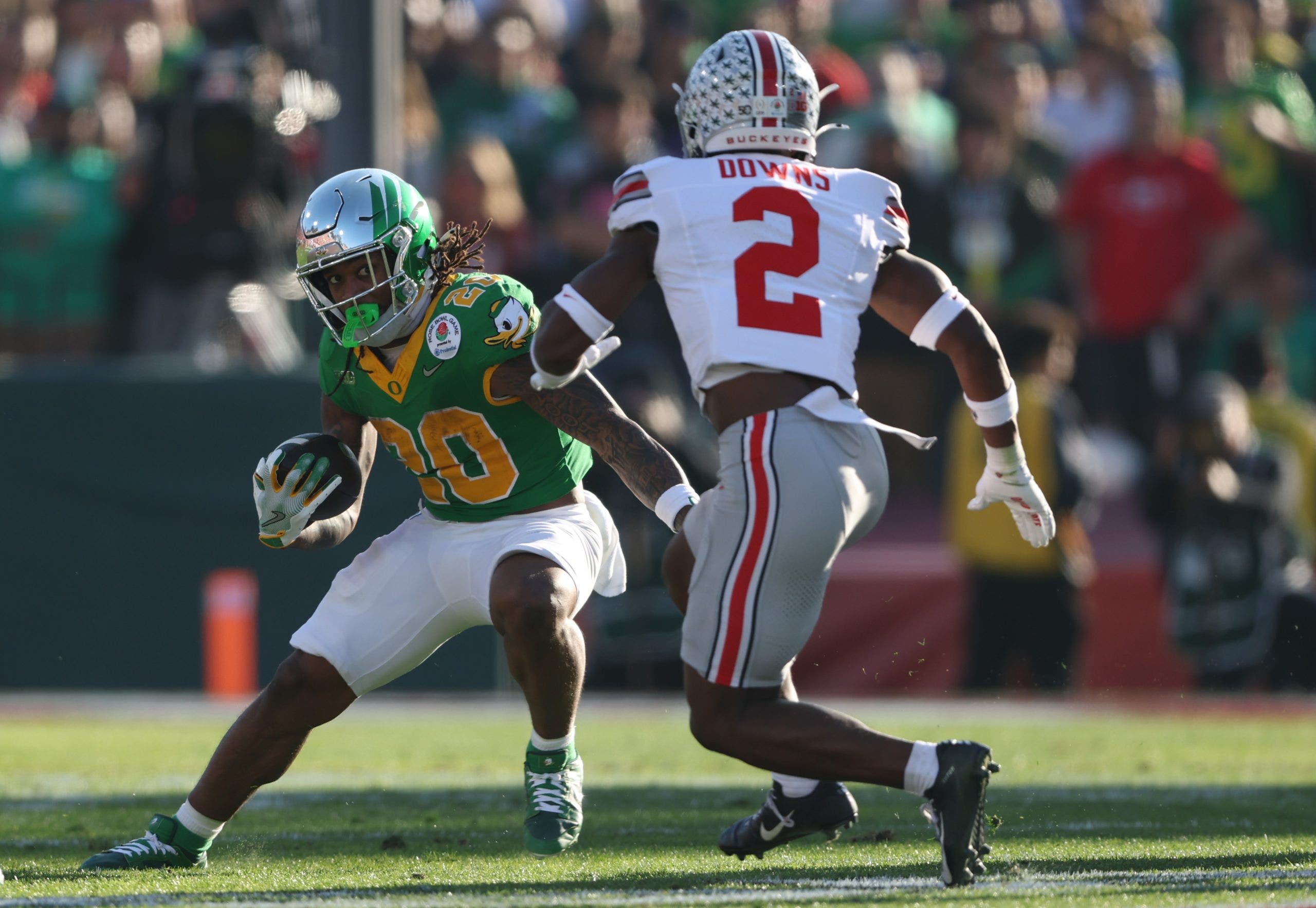 Caleb Downs of the Ohio State Buckeyes looks to tackle Oregon running back Jordan James in the second quarter during the Rose Bowl Game. (Photo by Sean M. Haffey/Getty Images)
