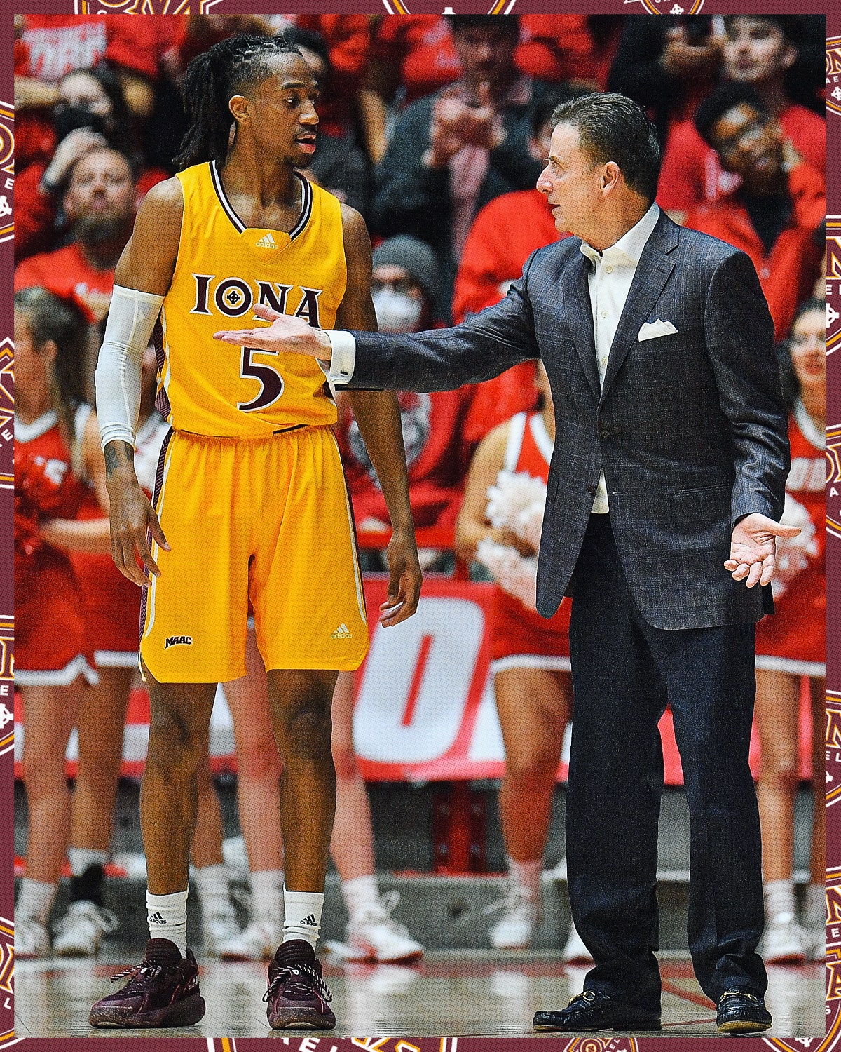 I remember the first time I heard from him was right when Covid hit, and our JUCO season got shut down. I was waiting for my Division I offers, and I was hearing from a bunch of schools. I was about to commit to Wichita State when I’m on Twitter randomly and I see Rick Pitino got hired at Iona, or was about to get hired at Iona. And then the next day, I get a call from him, he’s like, ‘This is Rick Pitino.’ I’m like, ‘What the heck?’ I pick it up and he basically says that he wants to recruit me and that I’m a great athlete and he wants me to play for him, and that my style fits him perfectly. After I hung up the phone, my high school coach and my JUCO coach were both like, ‘You have to go there immediately. No other option. No choice.’ So I just went.