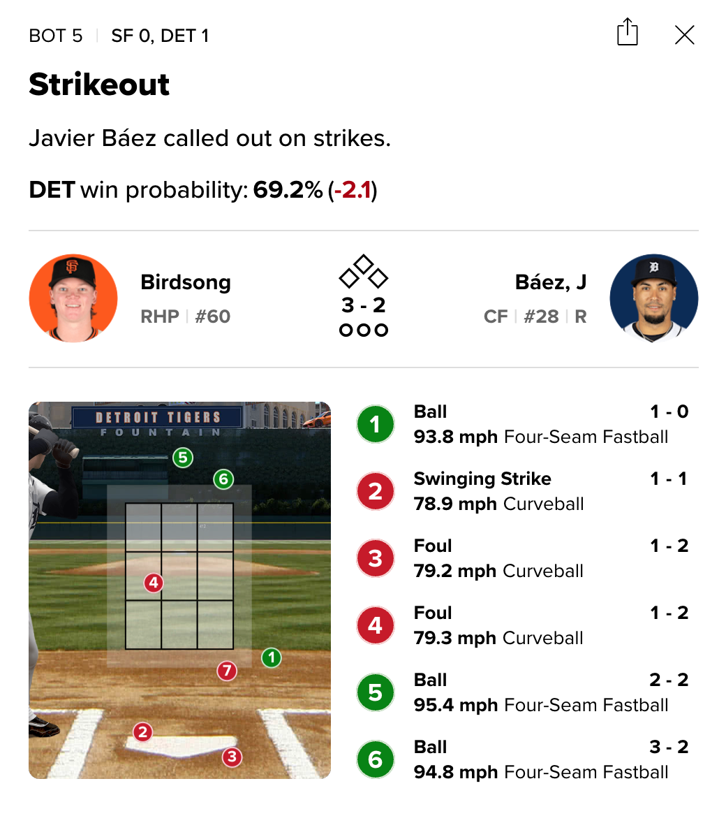 A borderline call that, when combined with the sixth pitch in the sequence, suggests that Cuzzi’s zone was running a little low there. As said: credit to Patrick Bailey for the frame job there, that’s why catchers get paid the… well, some amount of dollars.