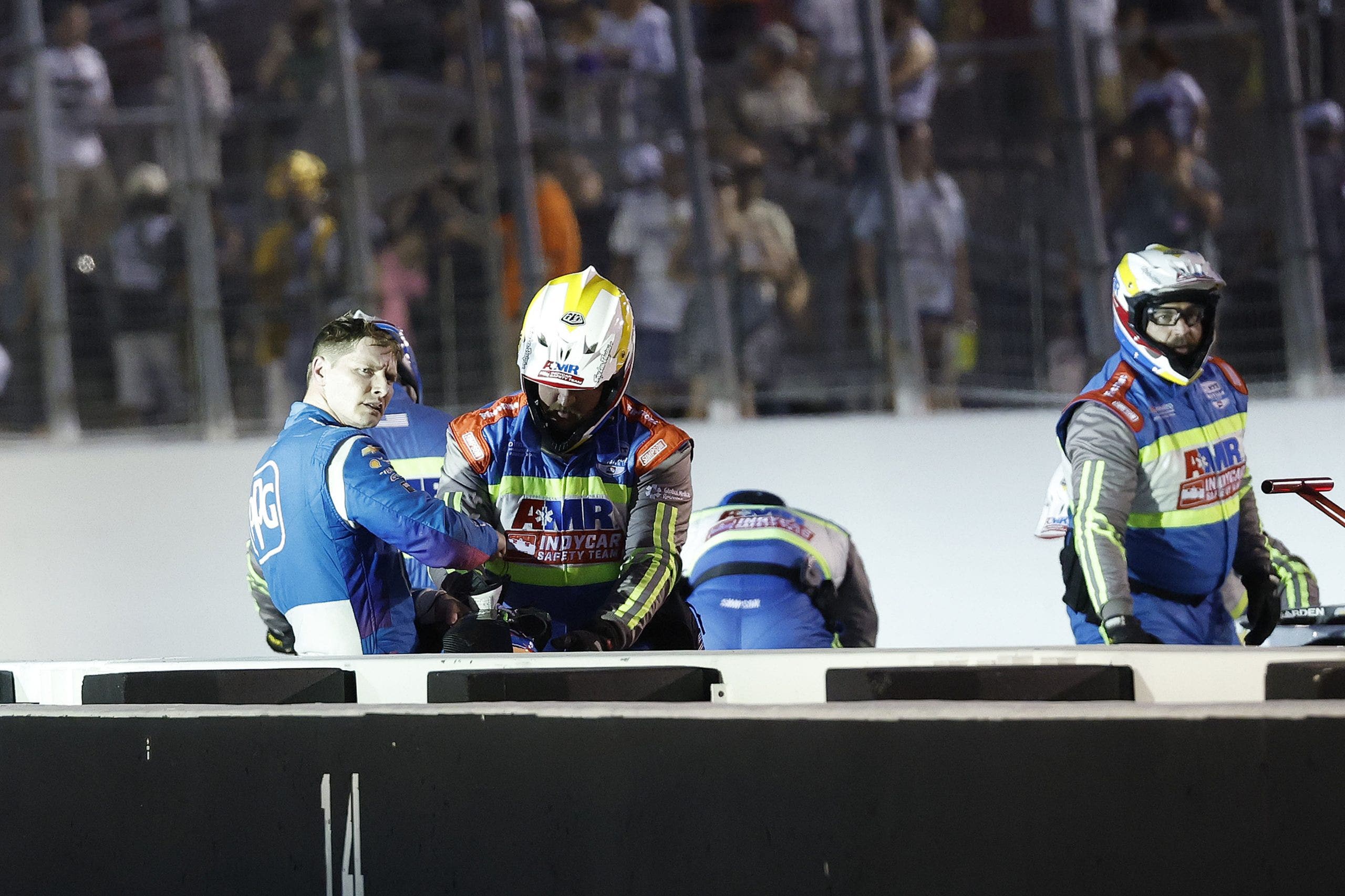 Josef Newgarden is attended to by safety team members following a hard crash in Sunday’s race.