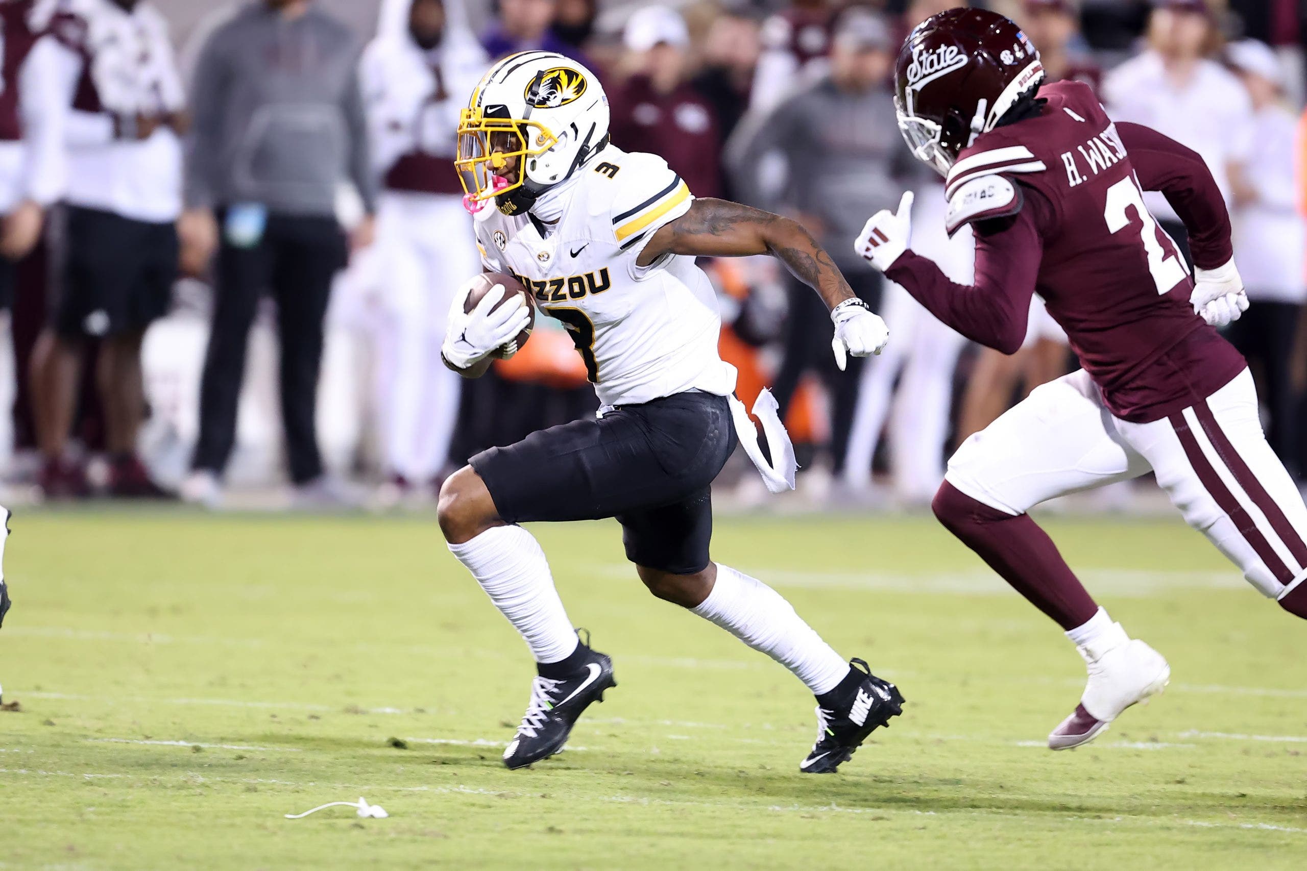 Missouri Tigers wide receiver Luther Burden III (3) during the game between the Mississippi State Bulldogs and the Missouri Tigers on November 23, 2024 at Davis Wade Stadium in Starkville, Mississippi.  (Photo by Michael Wade/Icon Sportswire via Getty Images)