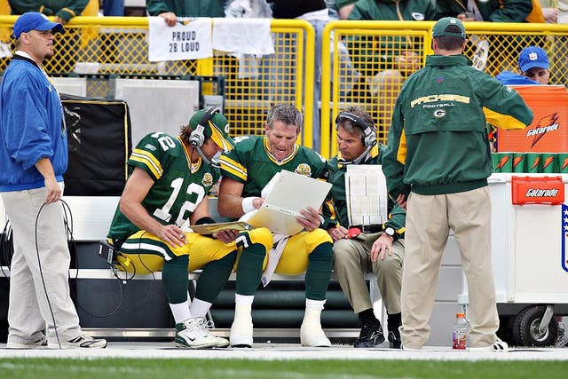 Green Bay Packers QB Brett Favre (4) discussing play with backup QB Aaron Rogers (12) on sidelines bench during game vs Philadelphia Eagles. Green Bay, WI 9/9/2007 CREDIT: John Biever (Photo by John Biever /Sports Illustrated via Getty Images) (Set Number: X78607 TK1 )